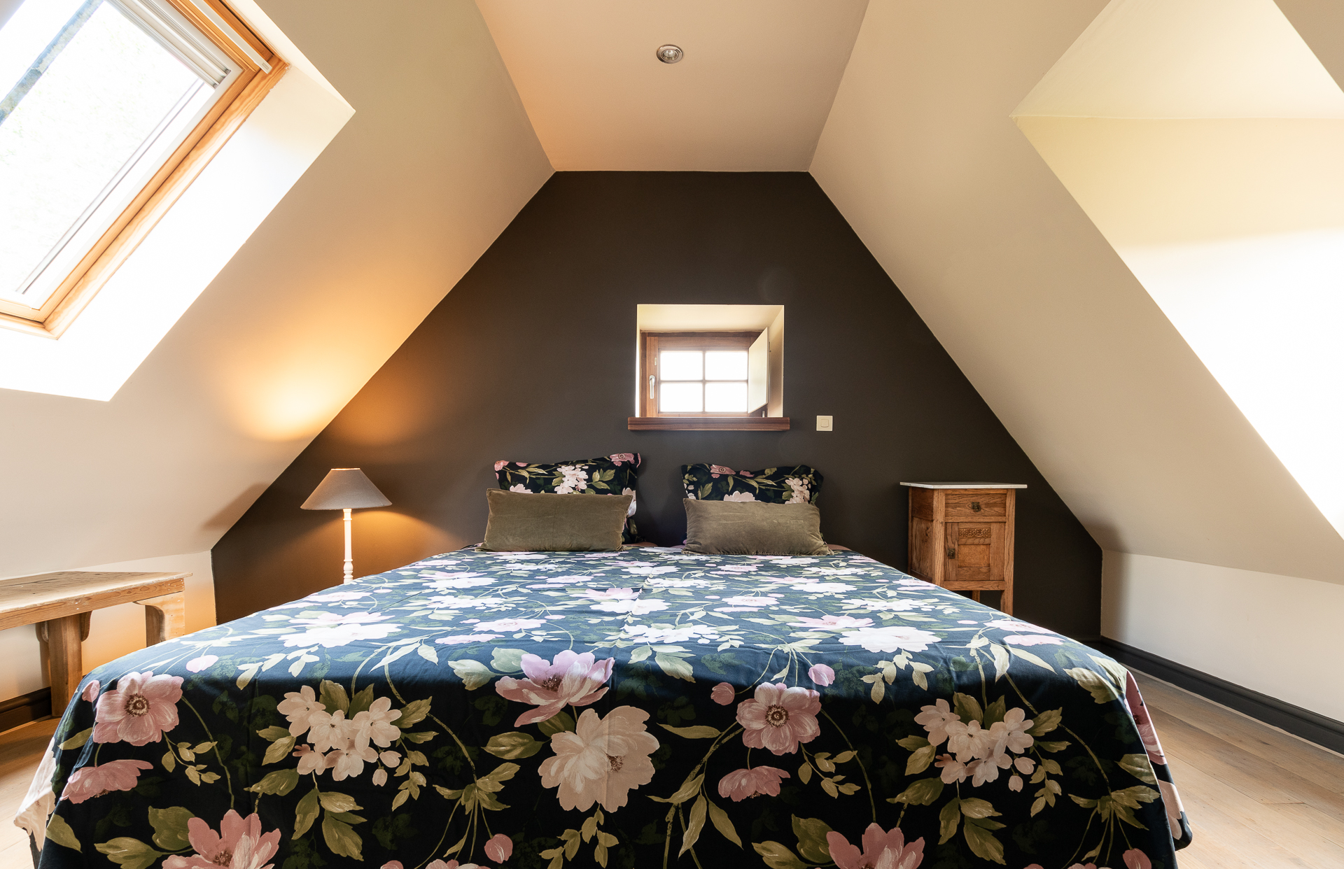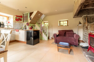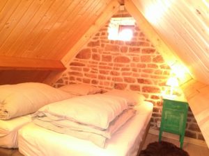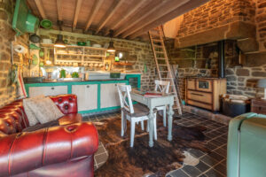 Characterful kitchenette with original fire-place and wood burner downstairs. On the first floor, you have the bathroom with shower and 1 lit divisible double bed. The only thing you will hear is a small stream at 25m away!