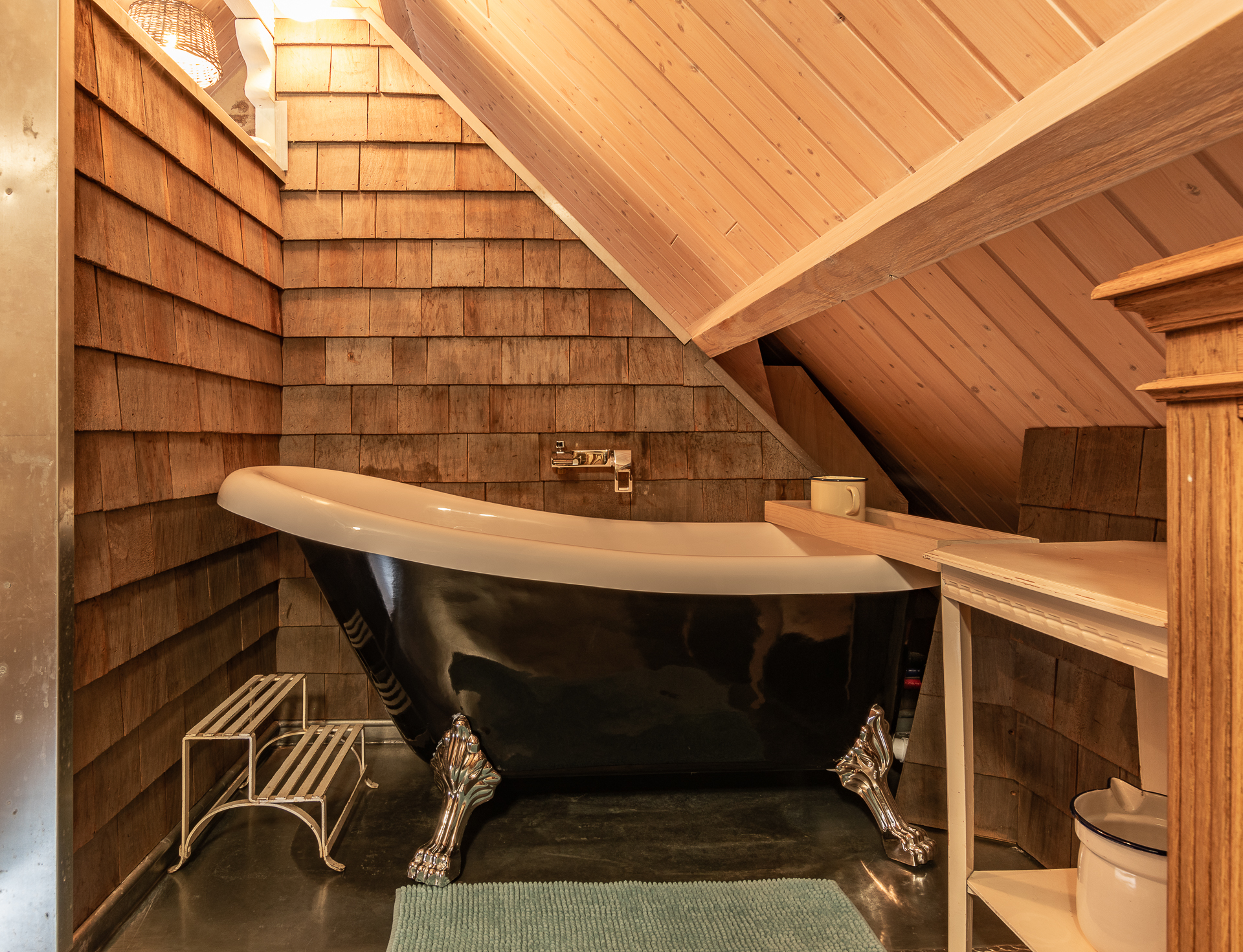 Downstairs there is a kitchenette, a very cozy wood stove, and a shower. There is a tilting ladder to go to the first floor, where you can find 1 divisible double bed.