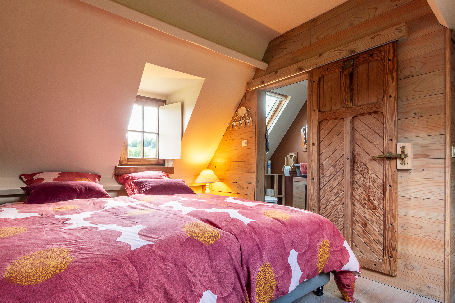 Middle sized-house is a converted milking-stable. No more cows here, but a complete kitchen and living room with a wood-stove downstairs. The first floor is equipped with 1 divisible double bed and a luxurious bathroom. Outside you have your own private garden, with a terrace and a nice view over the valley.
